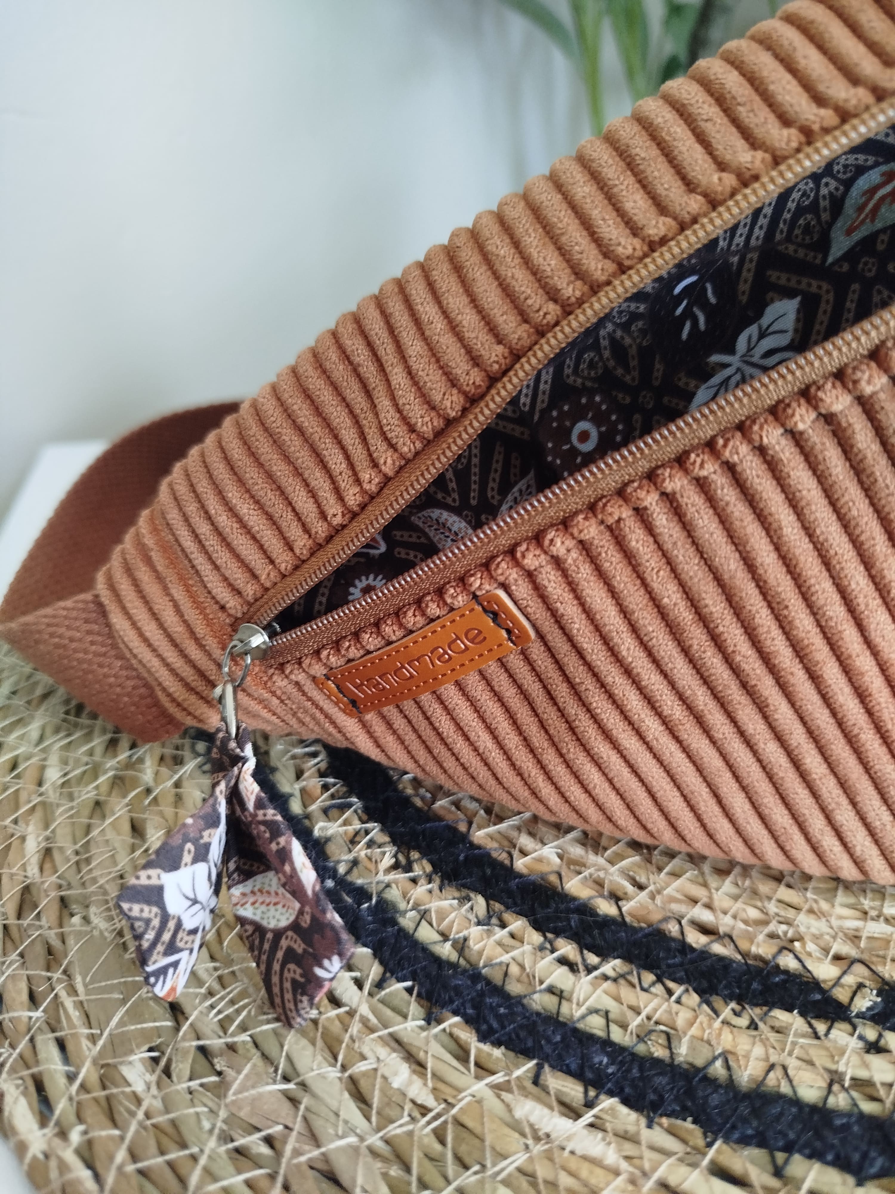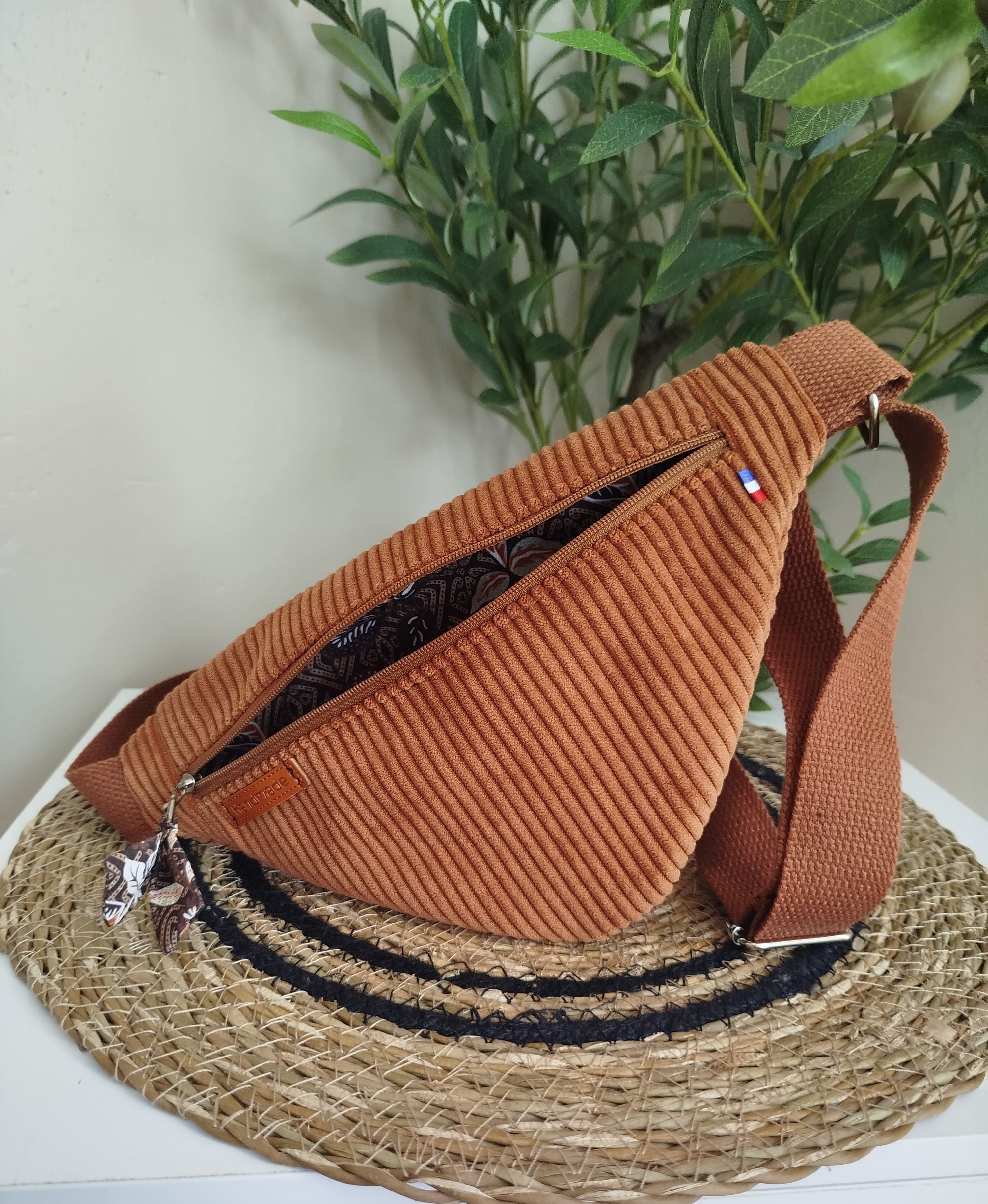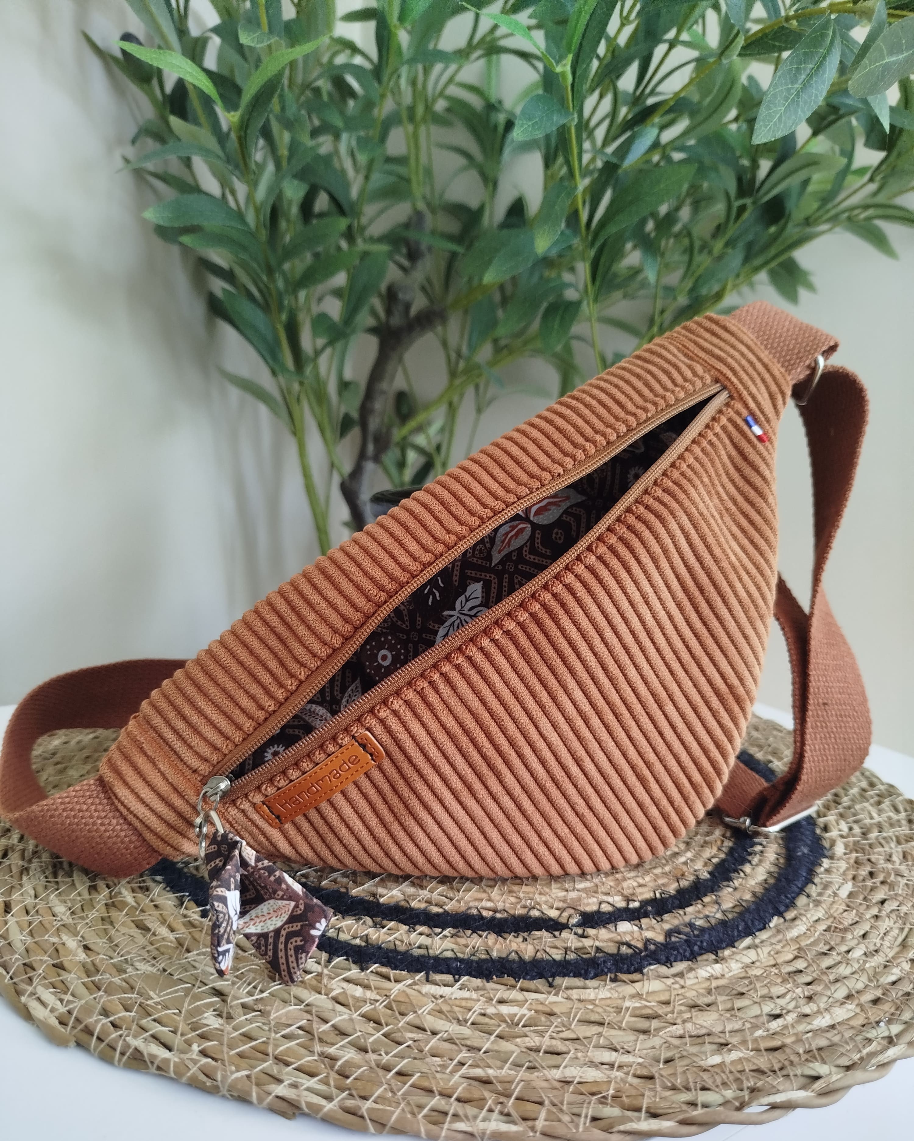 Cette banane est confectionnée dans un chic velours côtelé, issu de la nouvelle collection. Elle est entièrement doublée avec un coton à motifs "petites feuilles d'automne"- Etiquette marron fantaisie. La Bandoulière est réglable, selon l'utilisation souhaitée et peut être personnalisée, sur demande, selon votre morphologie.