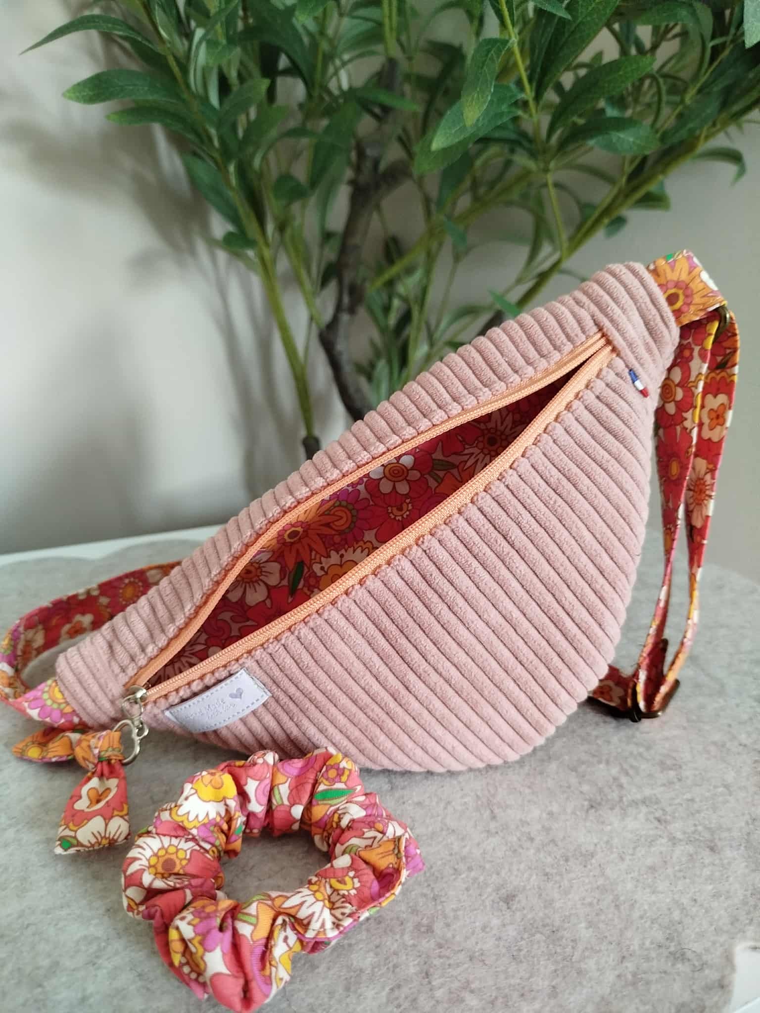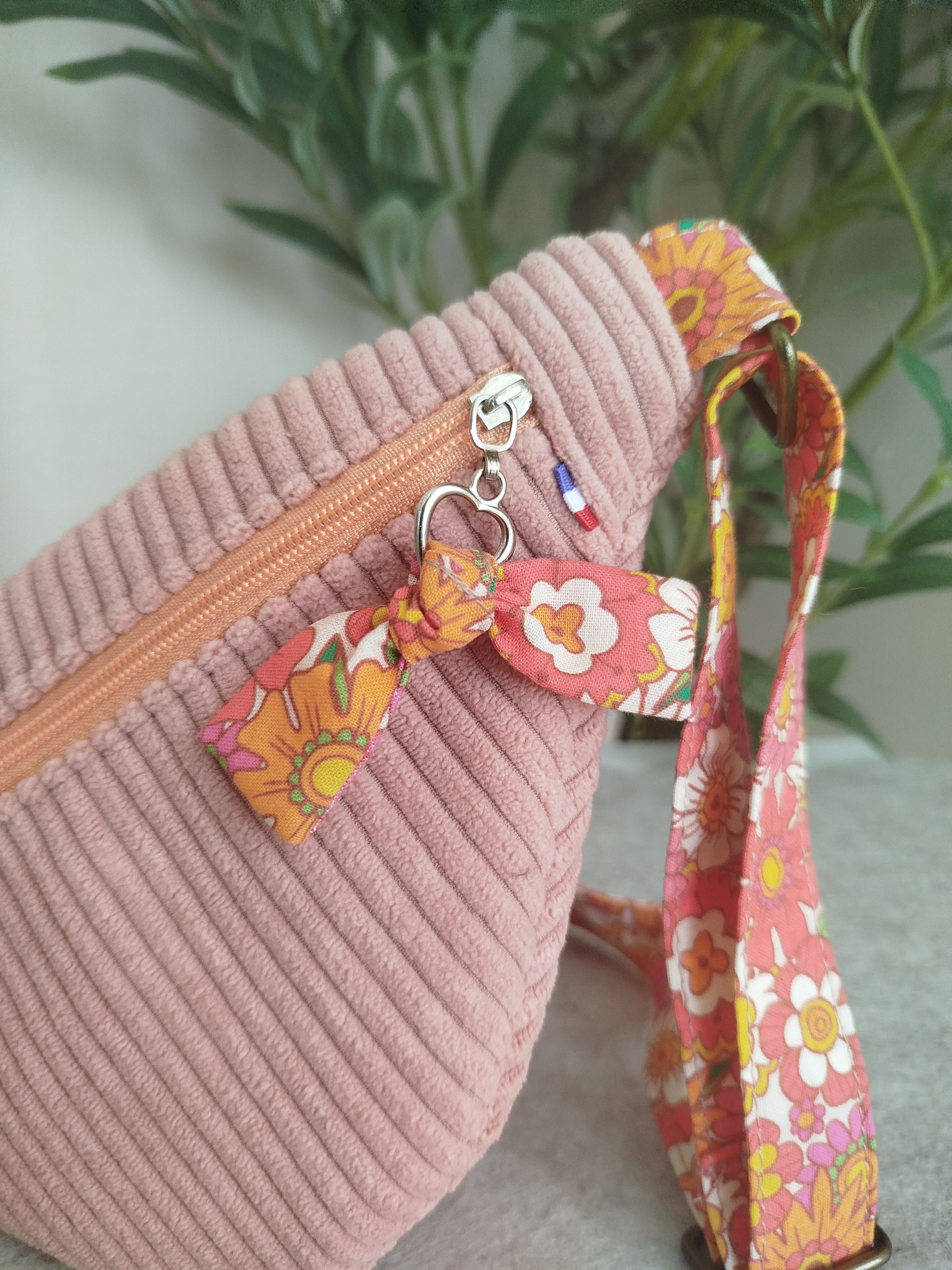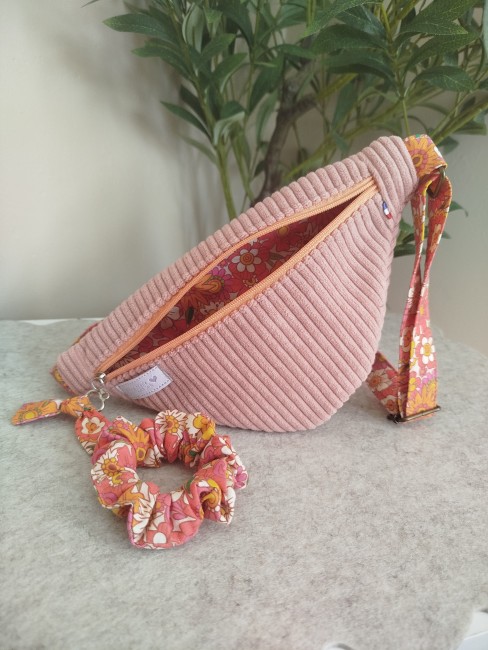Cette banane est confectionnée dans un velours côtelé très mignon. Elle est entièrement doublée avec un coton à motifs "petites fleurs"- Etiquette lila fantaisie sur la face avant. La Bandoulière souple est réglable.