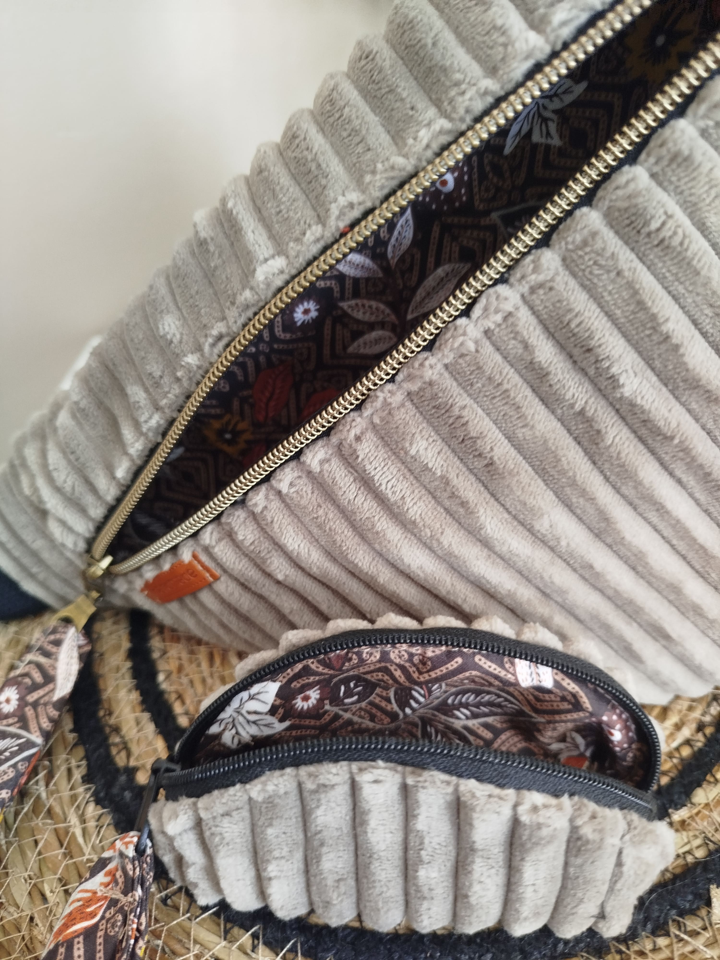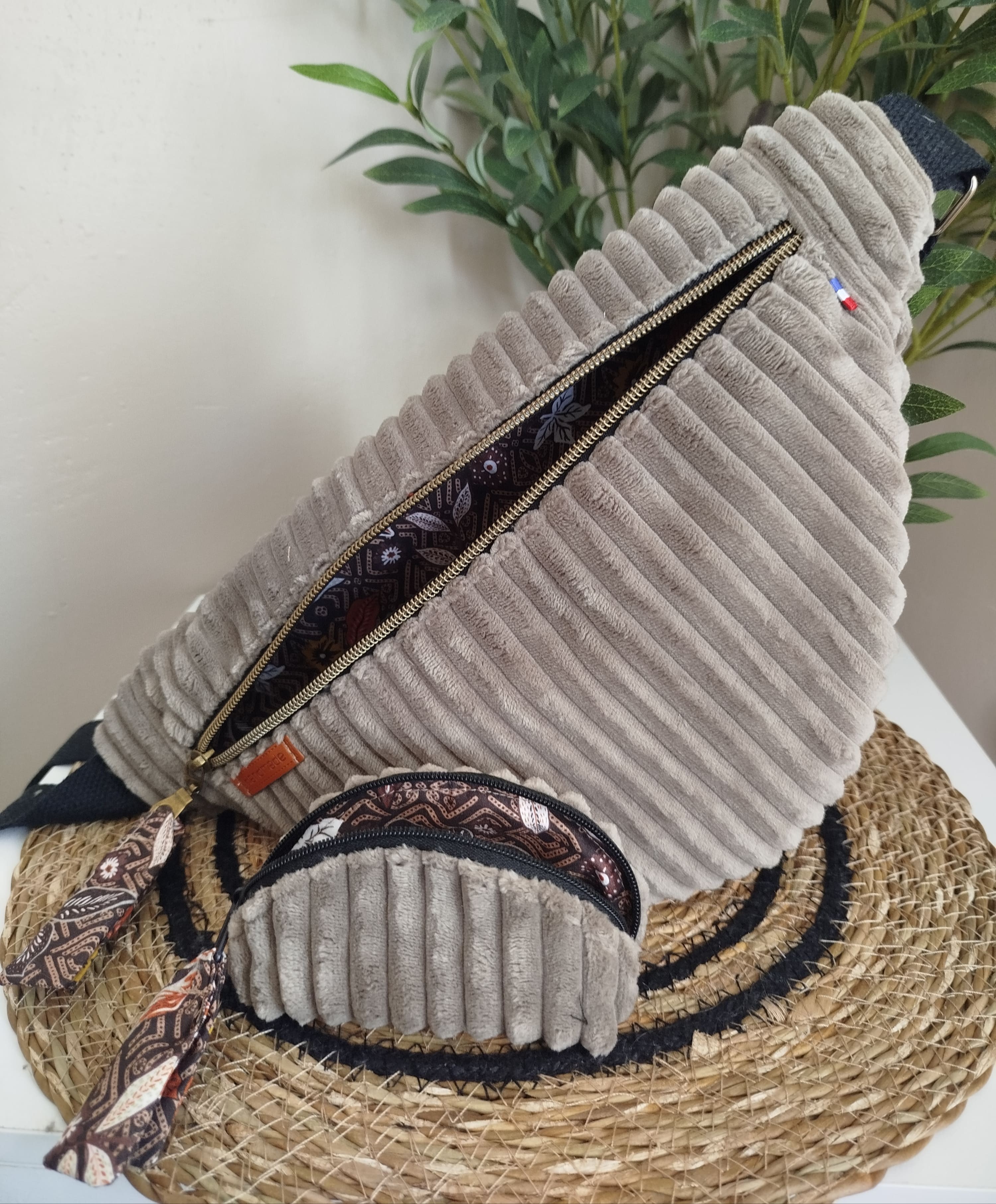Cette banane est confectionnée dans un chic velours en côtes ultra douces, issu de la nouvelle collection. Elle est entièrement doublée avec un coton dans les tons de l'automne - Fermeture de couleur noire et bronze, zippée. Etiquette fantaisie "handmade". La Bandoulière est réglable, selon l'utilisation souhaitée et peut être personnalisée, sur demande, selon votre morphologie.