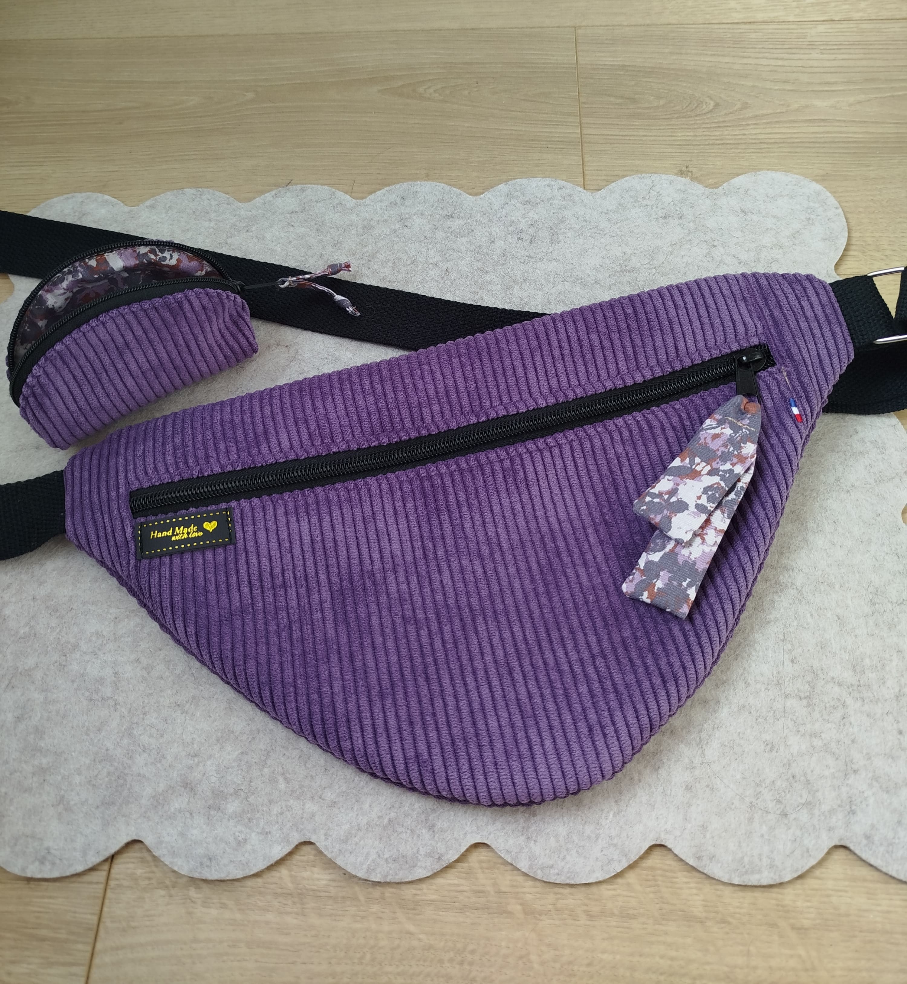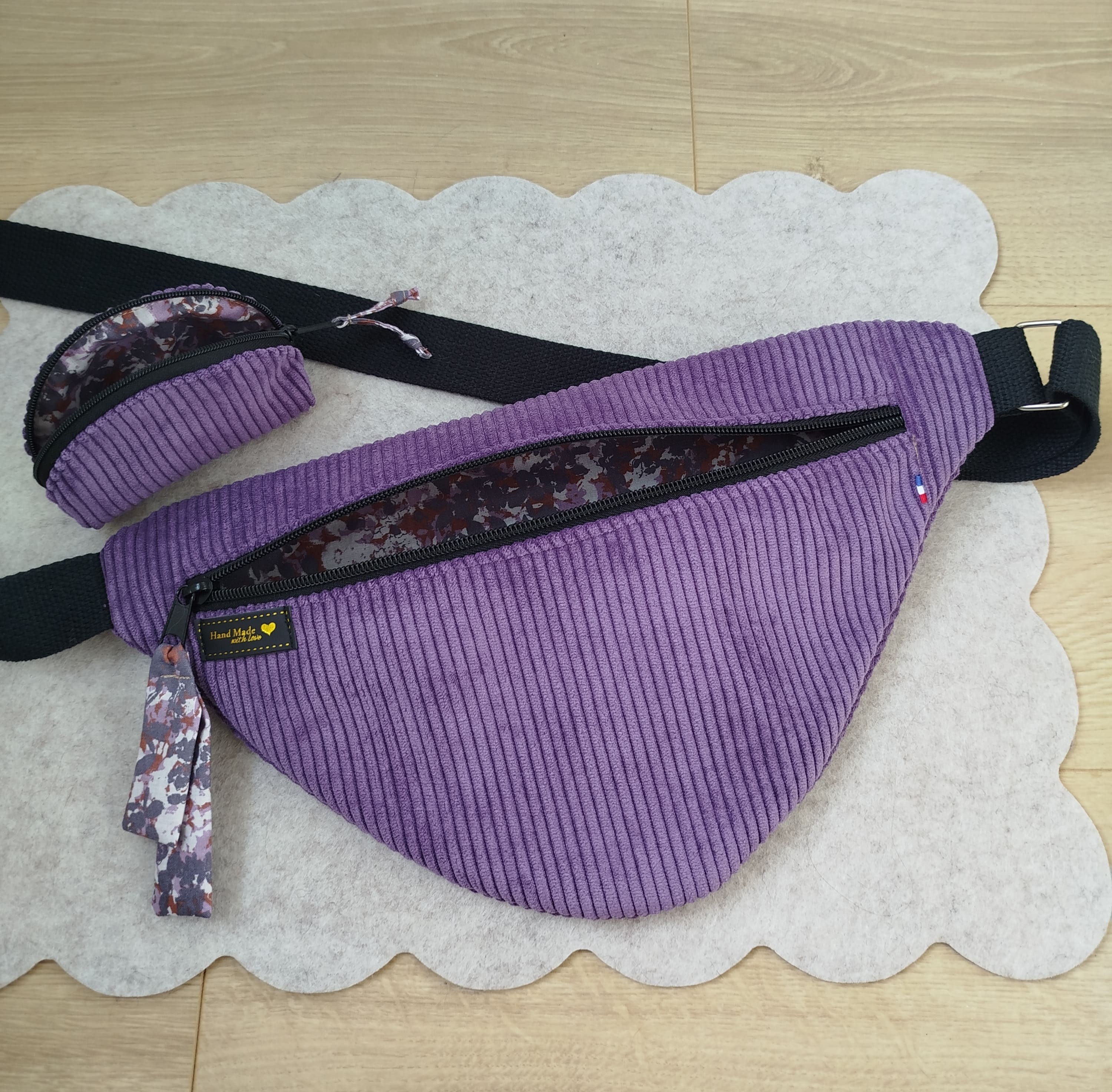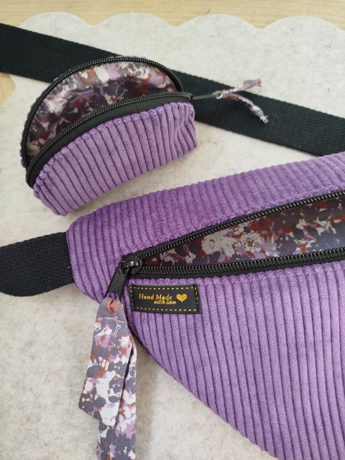 Très joli sac banane, se portant en bandoulière, fait main, en velours côtelé violet / mauve, accompagné de son porte-monnaie assorti (10 cm * 8 cm)