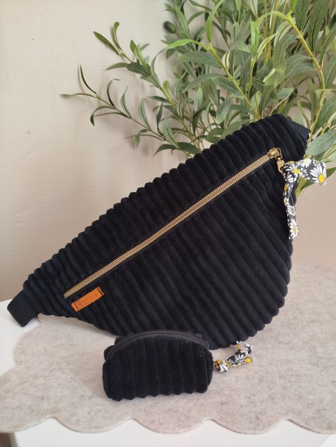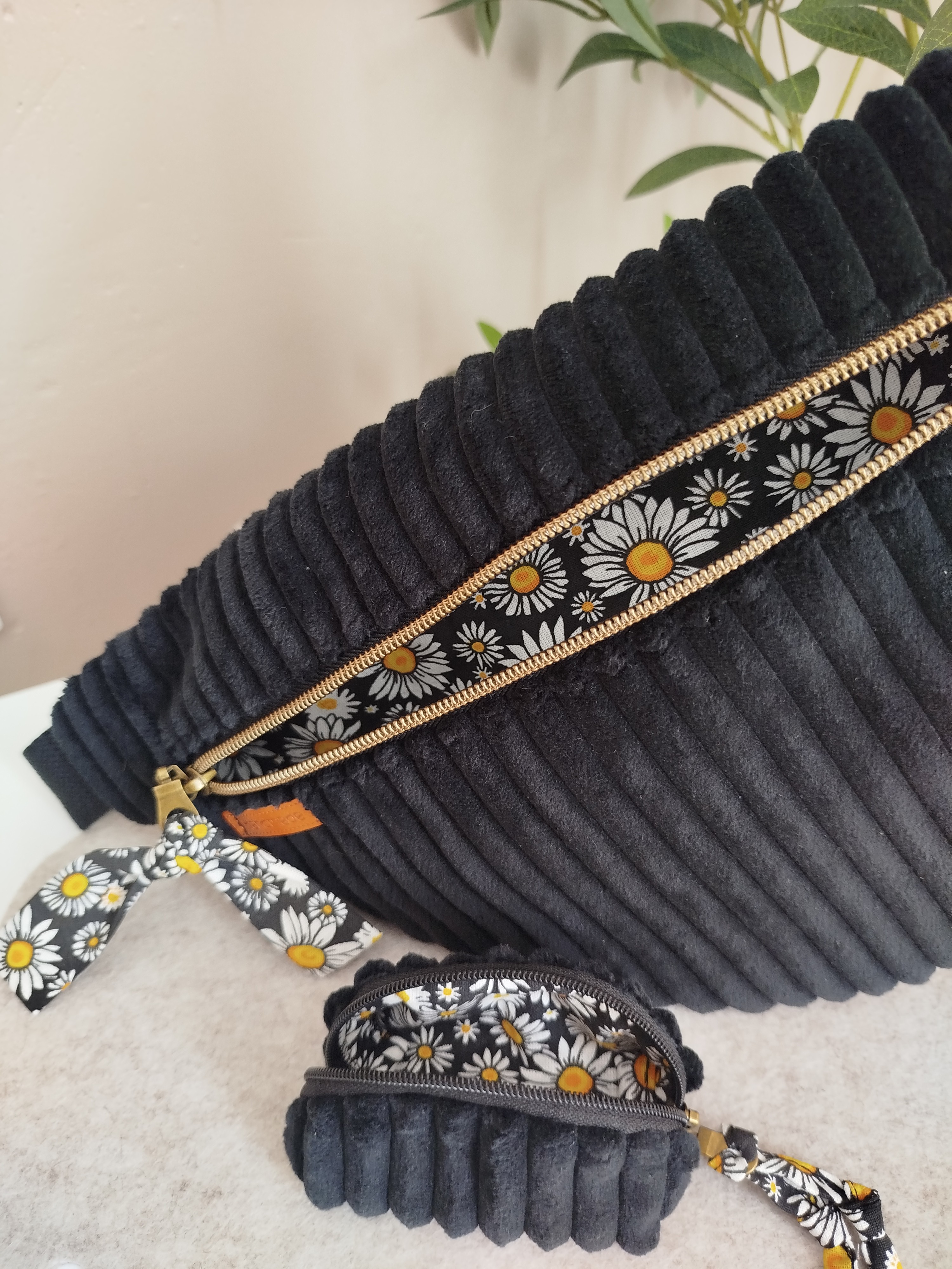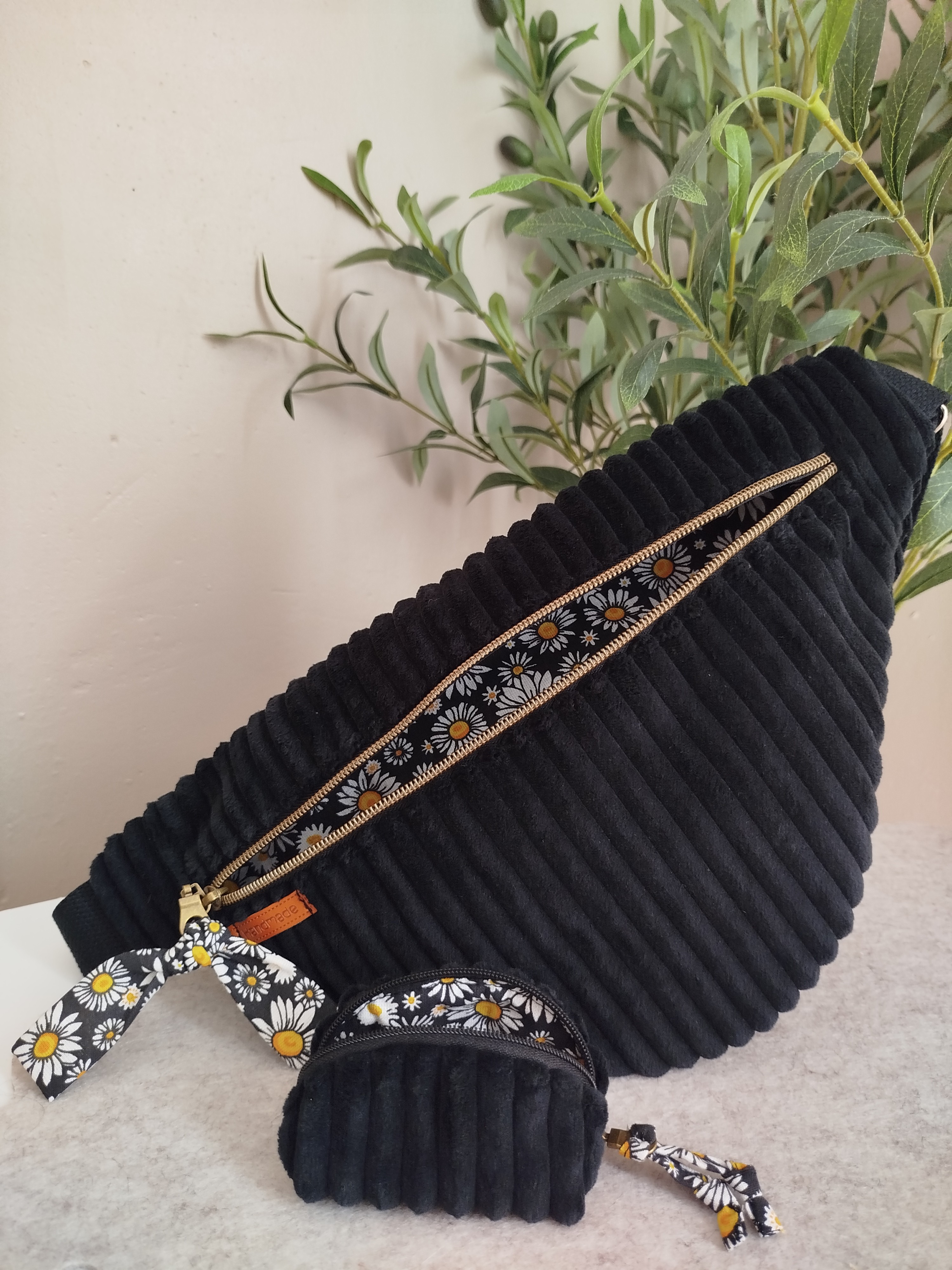 Cette banane est confectionnée dans un chic velours en côtes ultra douces, issu de la nouvelle collection. Elle est entièrement doublée avec un coton à motifs marguerites, pour une touche d'élégance et de féminité - Fermeture de couleur noire et bronze, zippée. Etiquette fantaisie "handmade" marron sur la face avant du sac. La Bandoulière est réglable, selon l'utilisation souhaitée et peut être personnalisée, sur demande, selon votre morphologie.