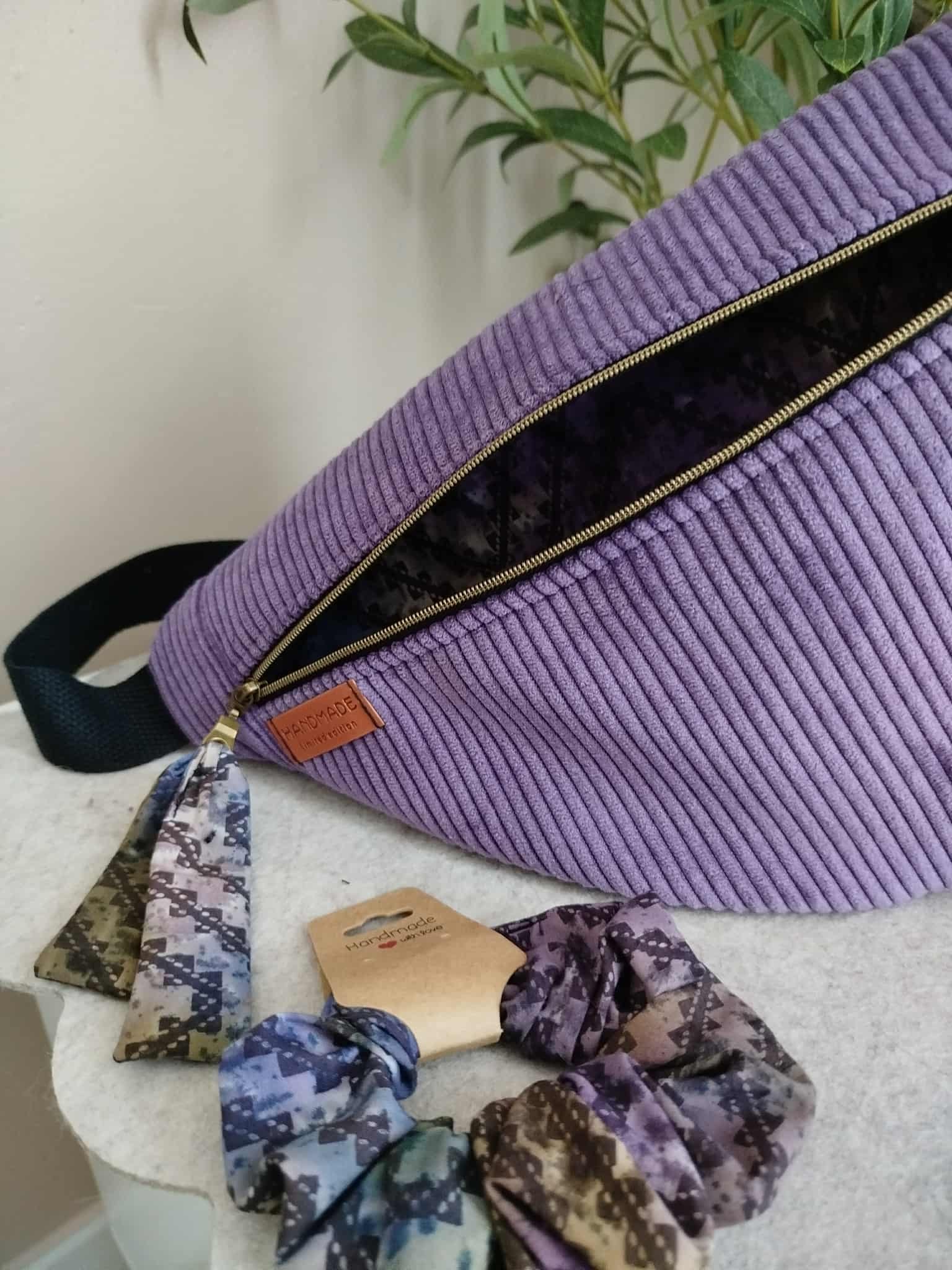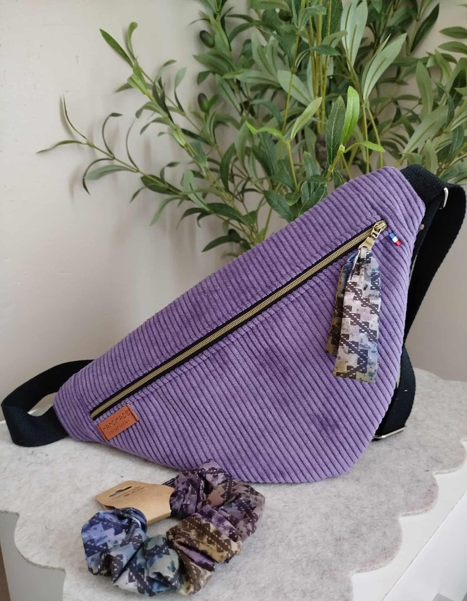 Superbe sac banane “violet/lila” se portant en bandoulière accompagné de son élastique pour les cheveux assorti.